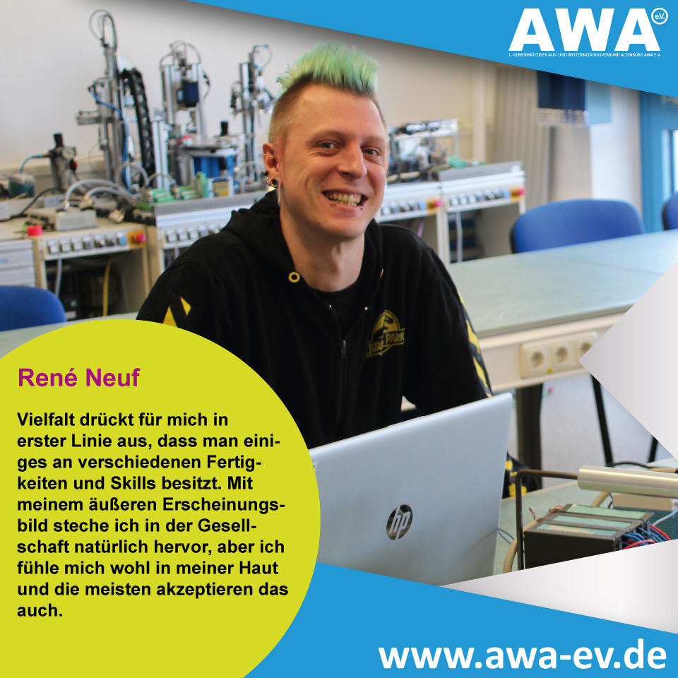 Aktuell mache ich meine Umschulung im AWA e.V. und habe bereits meinen „Industriemechaniker“ hier abgeschlossen. Während dieser Zeit habe ich mich entschieden, weiterzumachen um den „Mechatroniker“ anzuhängen. Als #Mechatroniker benötigt man technisches Verständnis, Fingerfertigkeit und man sollte gut in Mathe sein. Wenn ich mich in 3 Worten beschreiben sollte dann bin ich eindeutig: #crazy #laut und #zuverlässig