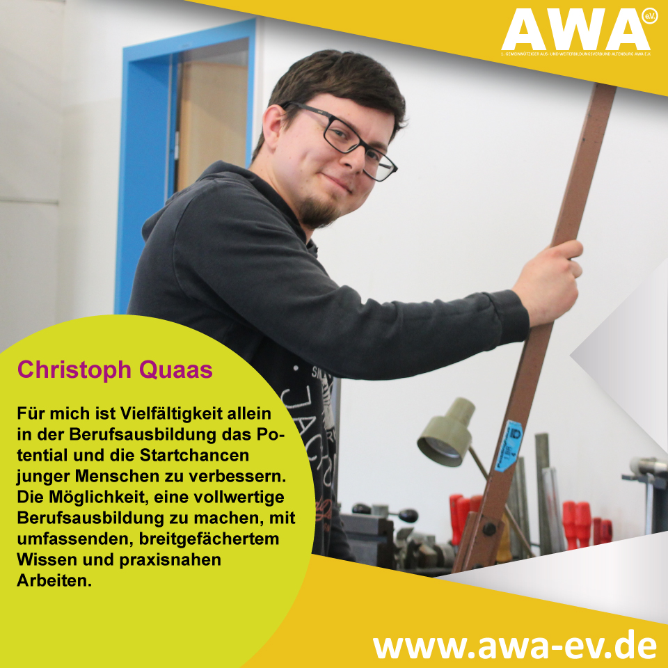 Über einen Kumpel erfuhr ich erstmals über den AWA e.V., woraufhin ich mich entschied, hier meine Erstausbildung zu machen. Nachdem ich in die einzelnen Abteilungen hineinschnuppern durfte, entschied ich mich für den Beruf „Maschinen-und Anlagenführer“. Mein weiterführendes Ziel ist im Anschluss der „Zerspanungsmechaniker“. Als #MaschinenundAnlagenführer benötigt man Handfertigkeiten und muss gute Kenntnisse über die Werkstoffe Metall-und Kunststoffe besitzen. Außerdem gehört das richtige Bedienen und Einstellen der Maschinen, sowie Drehen, Fräsen und Bohren mit zu meinen Aufgaben. Wir haben hier in der AWA ein angenehmes Arbeitsklima und sympathische Ausbilder die sich für uns auch die Zeit nehmen, um jeden einzelnen individuell zu fördern. In 3 Worten würde ich mich als #zuverlässig #lernwillig und #organisiert beschreiben.