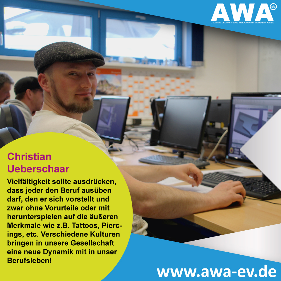 Ich bin über meinen Arbeitgeber der BIKAR-Aluminium GmbH zum AWA e.V. gestoßen und mache in Kooperation mit BIKAR eine Umschulung zum #Industriemechaniker mit dem Schwerpunkt Instandhaltung. Wir arbeiten in dem Beruf im Prinzip für die Digitalisierung und Industrie 4.0. und sind für die Instandhaltung, sowie die Wartung der Maschinen verantwortlich, was eine verantwortungsvolle, aber auch ab und an knifflige Aufgabe ist. Würde ich mich mit 3 Worten beschreiben müssen, dann bin ich auf jeden Fall #aufgeschlossen #verträglich und sehr #gewissenhaft